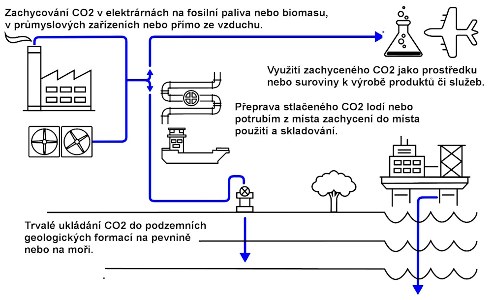 Proces CCUSProces CCUS (carbon capture, utilisation and storage) resp. CCS zahrnuje zachycování CO2, zpravidla z velkých bodových zdrojů, jako jsou elektrárny nebo průmyslová zařízení, která používají jako palivo fosilní paliva nebo biomasu. Pokud se zachycený CO2 nevyužívá na místě, stlačuje se a přepravuje potrubím, lodí, po železnici nebo nákladními auty, aby se využil v řadě aplikací, nebo se vstřikuje do hlubokých geologických formací, jako jsou vyčerpané zásobníky ropy a zemního plynu nebo slané vodonosné vrstvy.